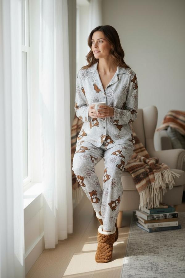 Γυναικεία Βελούδινη Πιτζάμα Με Κουμπιά & Αρκουδάκια