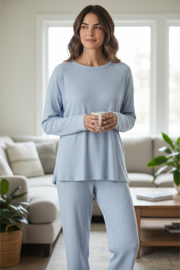 Γυναικεία Πιτζάμα Rib με Μακρύ Μανίκι & Παντελόνι – Baby Blue