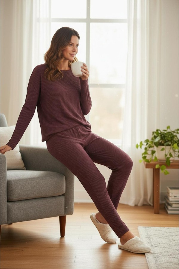 Γυναικεία Πιτζάμα Rib με Μακρύ Μανίκι & Παντελόνι – Μπορντό