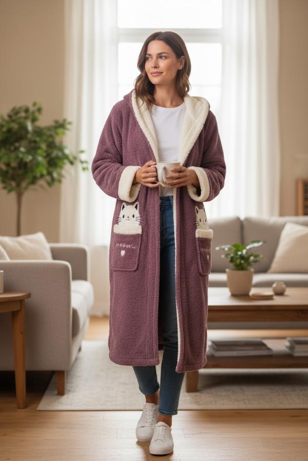 Γυναικεία Ρόμπα με Κουκούλα & Σχέδιο Γατούλες – Μωβ